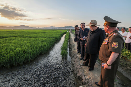 金正恩総書記は、水田ごとにナマズが群がっている素晴らしい光景を満足げに眺めながら、専門ナマズ工場でもない単位でわずか数人の従業員と家族で養殖を始めてから3年という短期間に、水田養魚に関する科学研究および生産を結合させて経済的効率と科学技術的保証を実証したことを高く評価した。